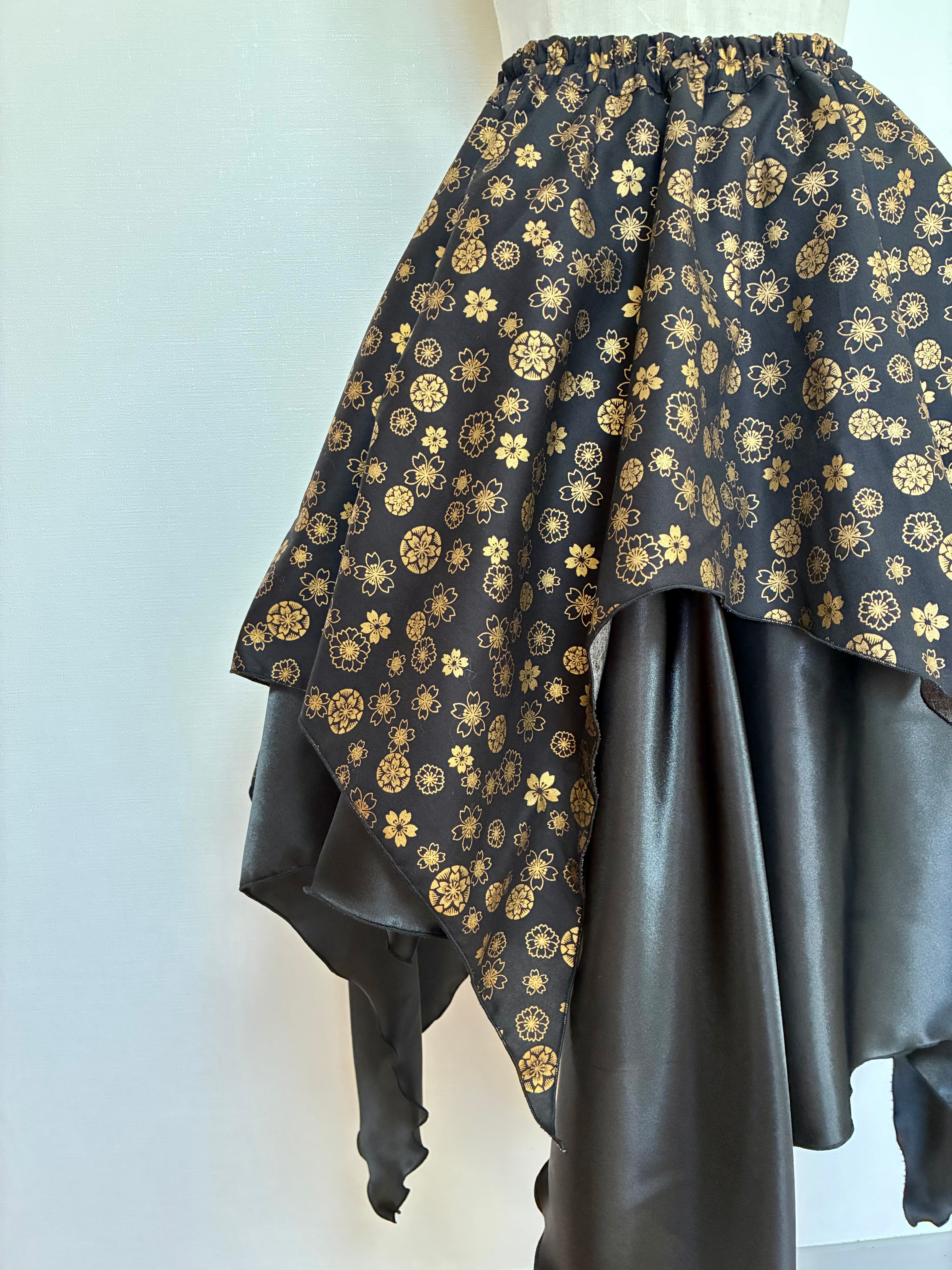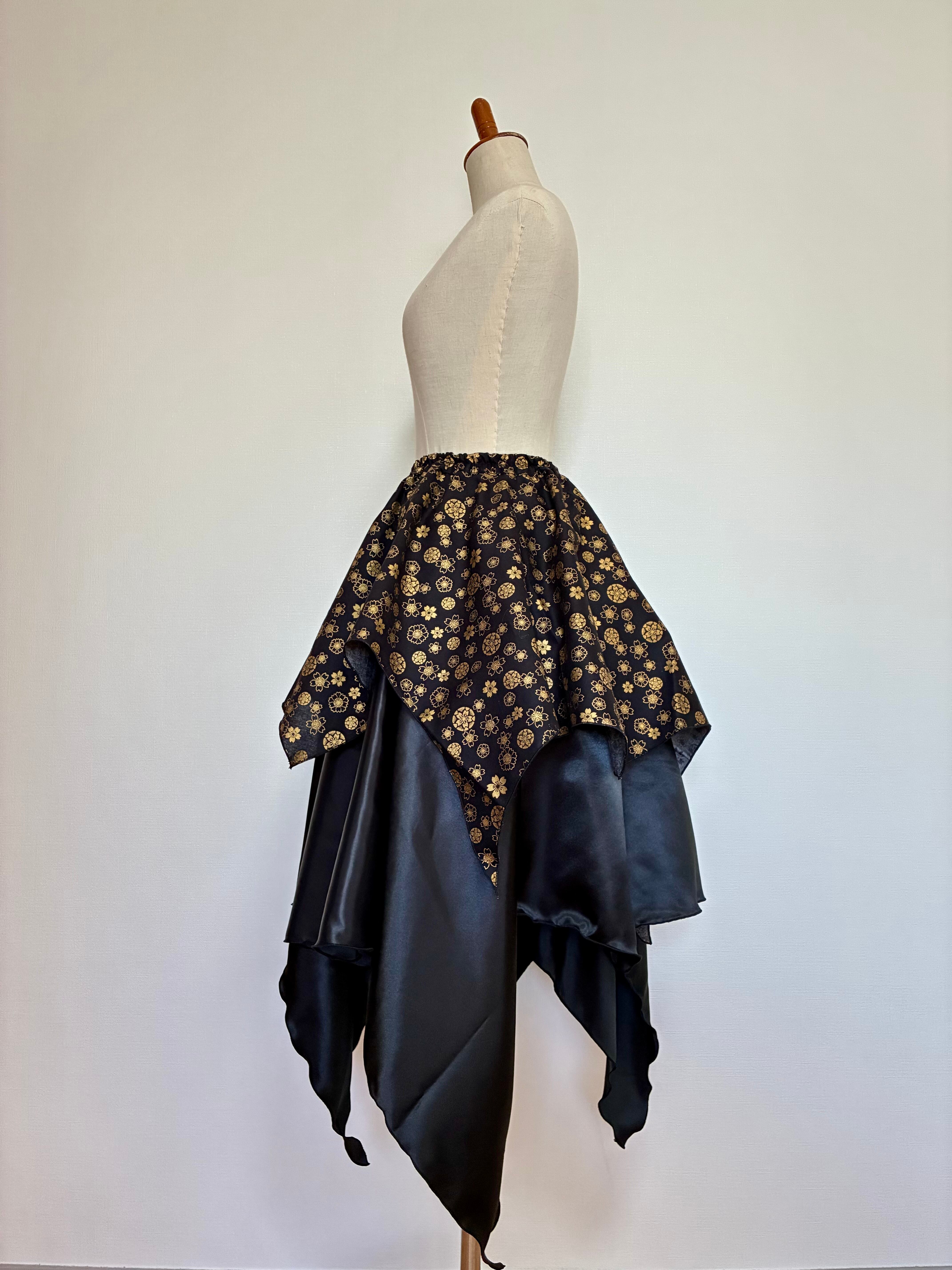 光沢の美しいサテン生地と、黒地に金模様が目を引く雅柄の2層スカートです。